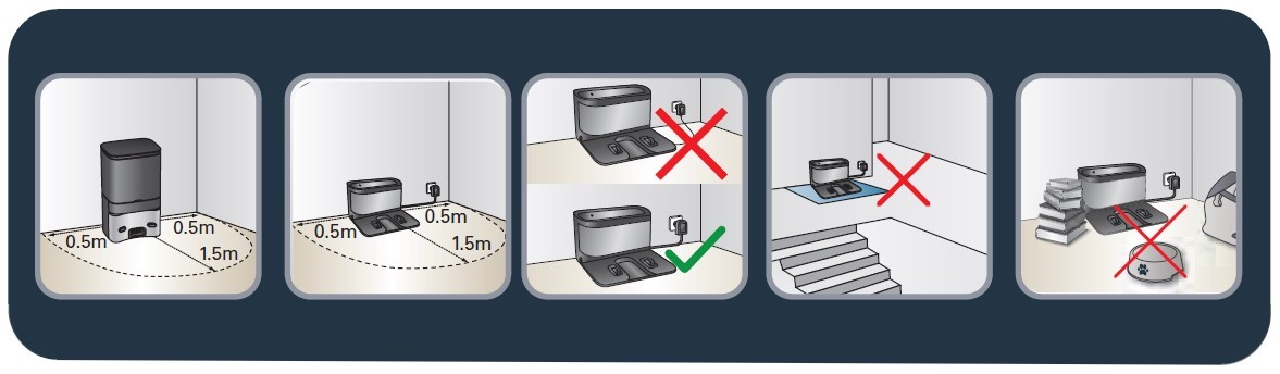 Cet emplacement devra être libre de tout obstacle (tapis compris), en laissant au moins 1,5 mètre d'espace libre à gauche et à droite, et 2 mètres à l'avant de la base. Si elle est installée dans un coin ou difficile à trouver, le robot aspirateur ne sera pas en mesure de l'atteindre.